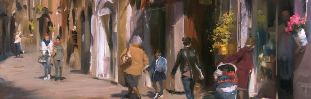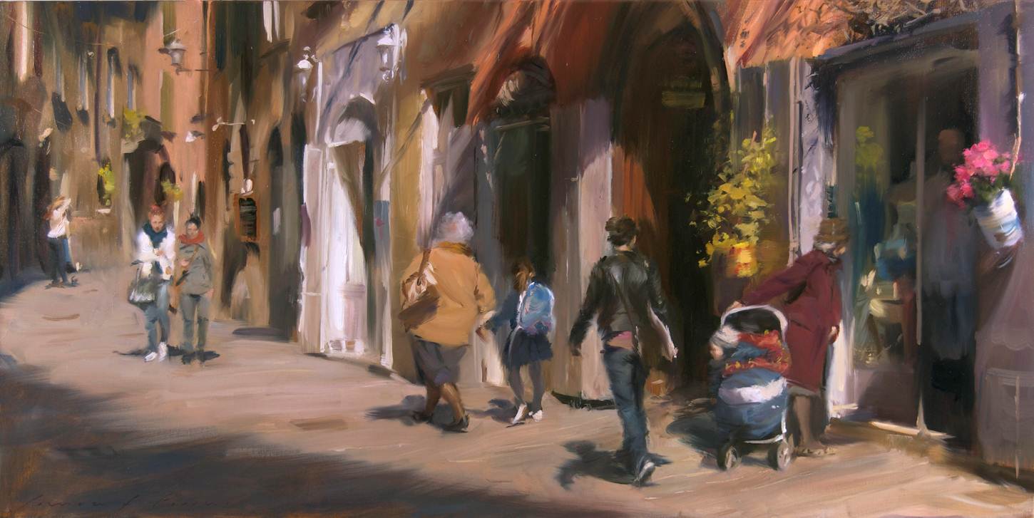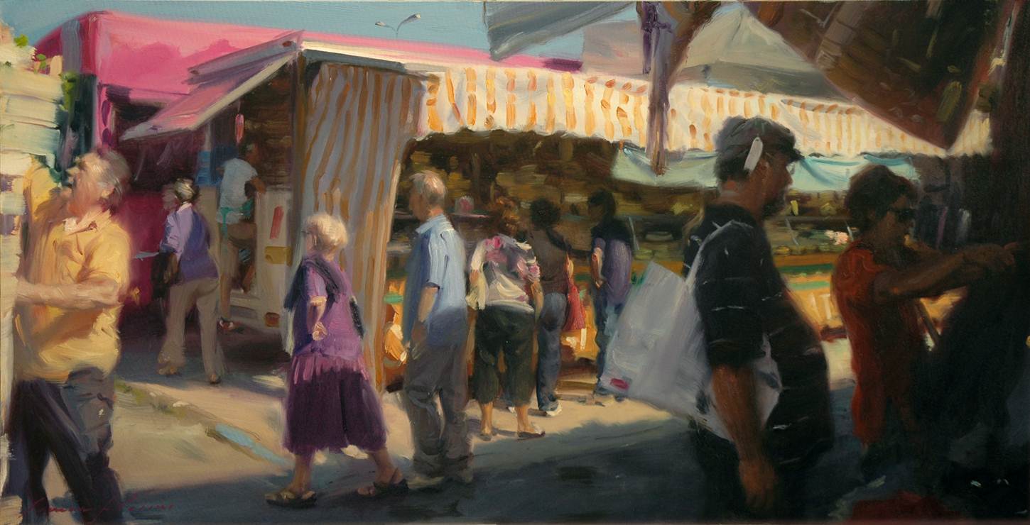 Inhaltlich kombiniert er gerne traditionelle Bildinhalte, wie Stadtansichten mit historischer Architektur in Erdtönen, mit neuen Komponenten, wie Leuchtreklame in grellen Farben. Ihn interessiert die Spannung, die zwischen den Dingen aufgebaut wird, Ähnliches gilt für seinen Malstil: